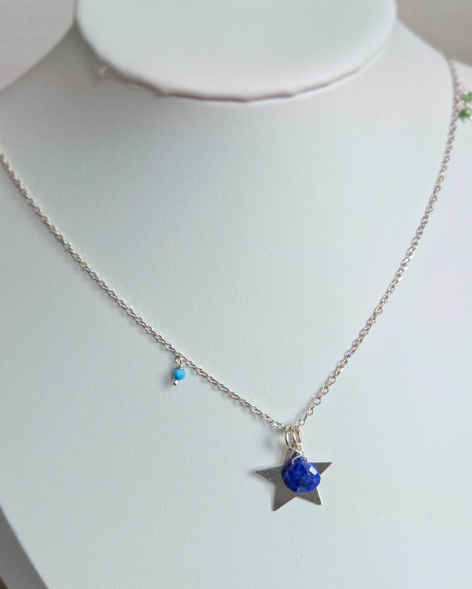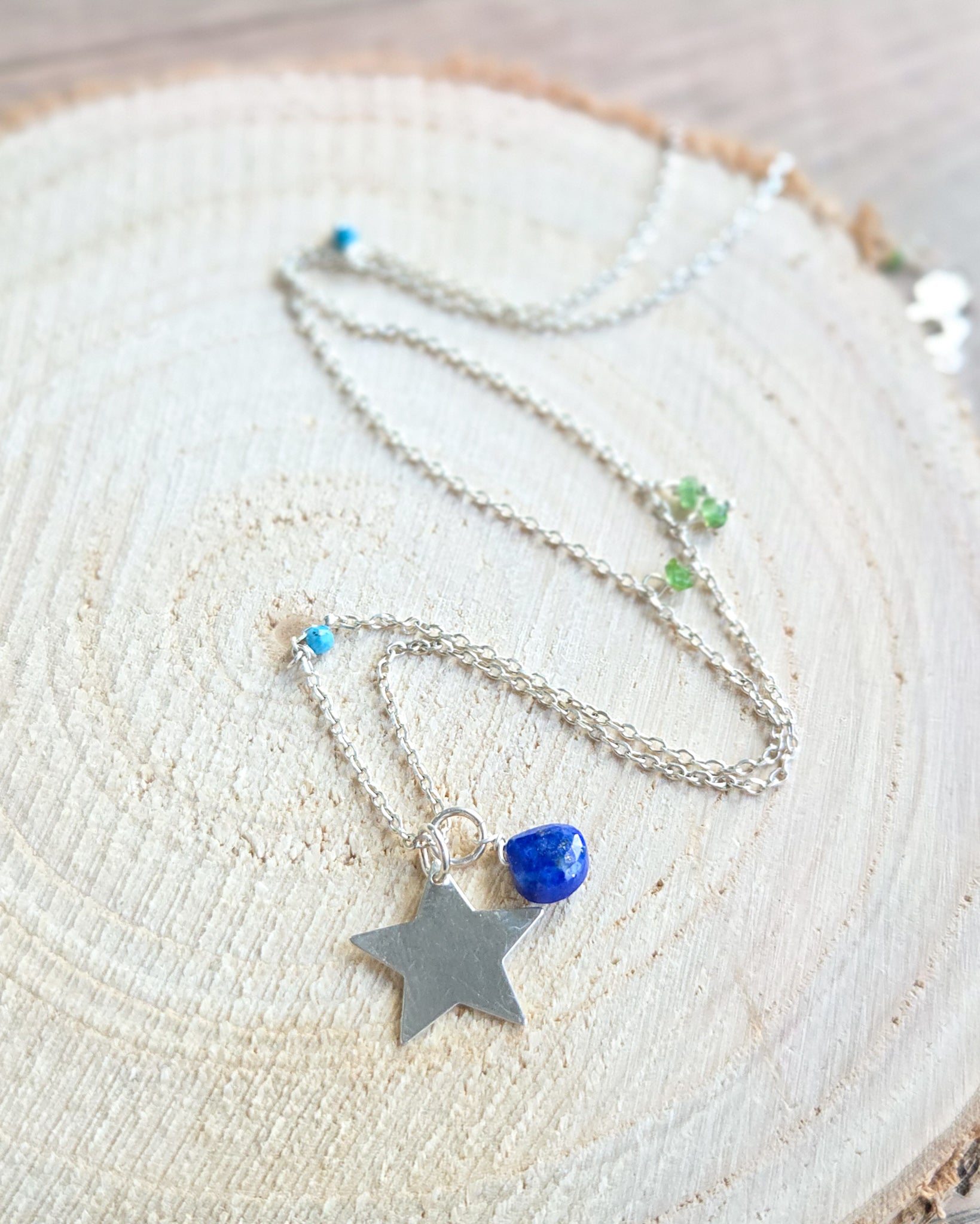 Collana in argento 925 con ciondolo a forma di stella e una piccola goccia di lapislazzuli blu naturali.