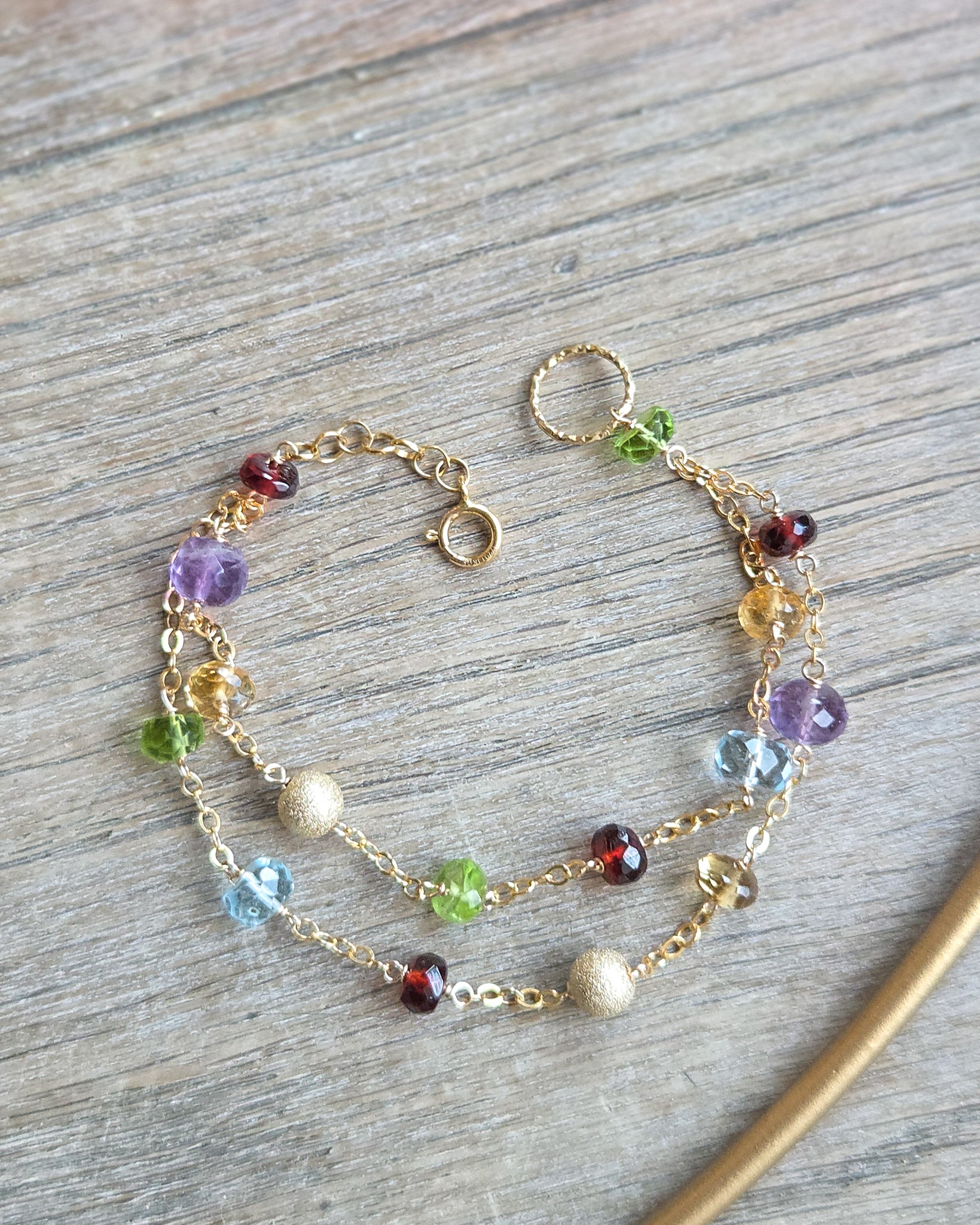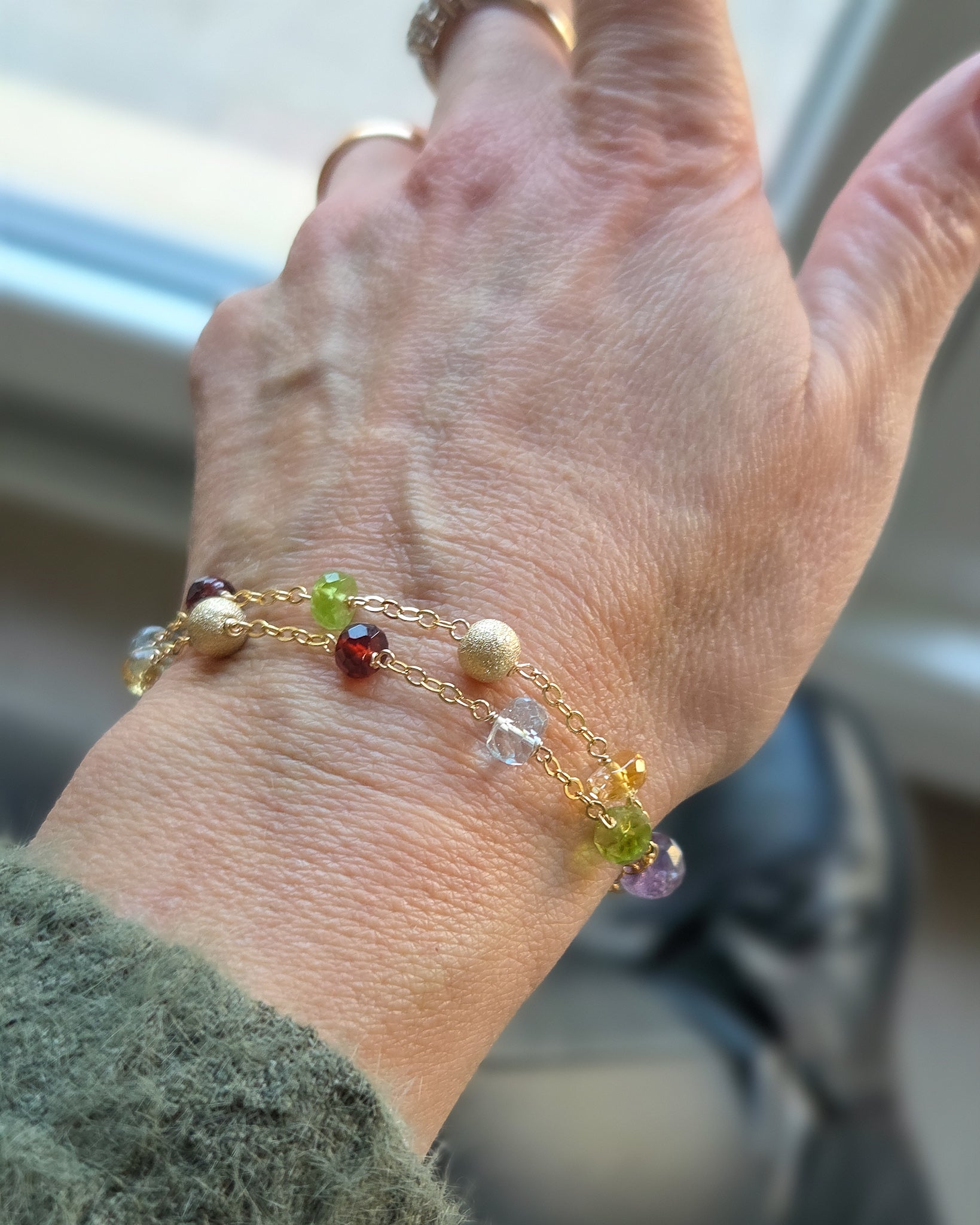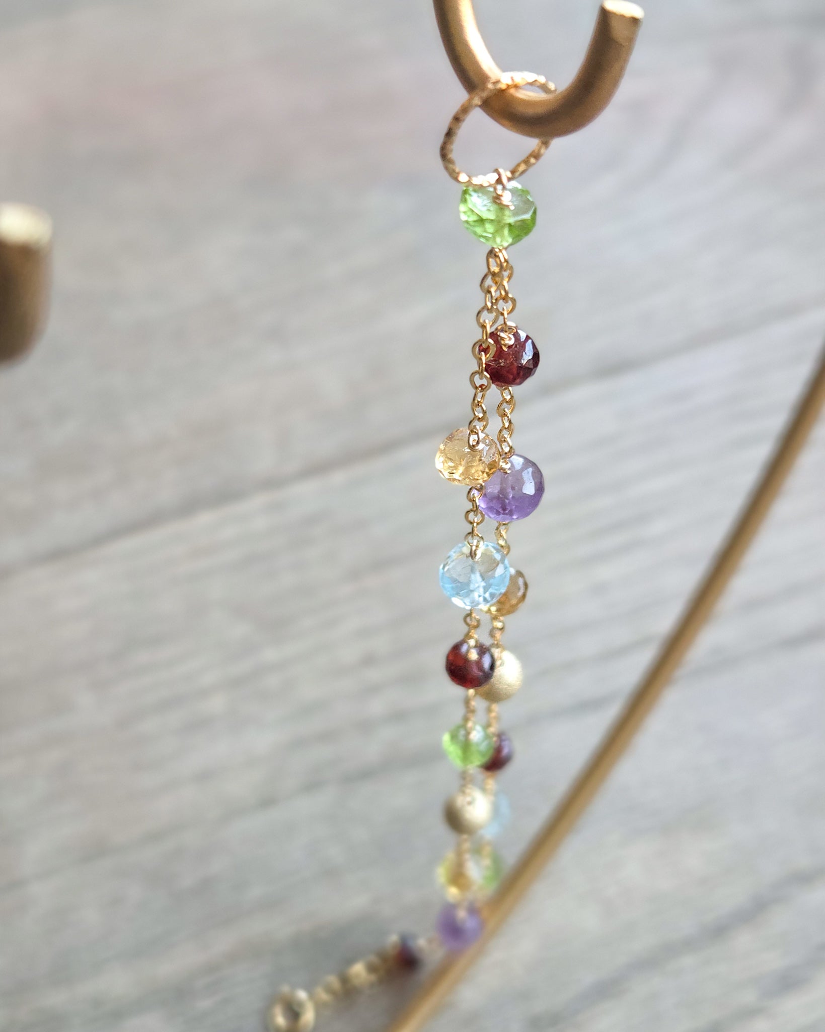 Cinque pietre naturali - ametista, citrino, granato, peridoto e topazio - si alternano a una piccola sfera d'oro. Ogni pietra custodisce un desiderio: equilibrio, fiducia, forza, rinnovamento, chiarezza.