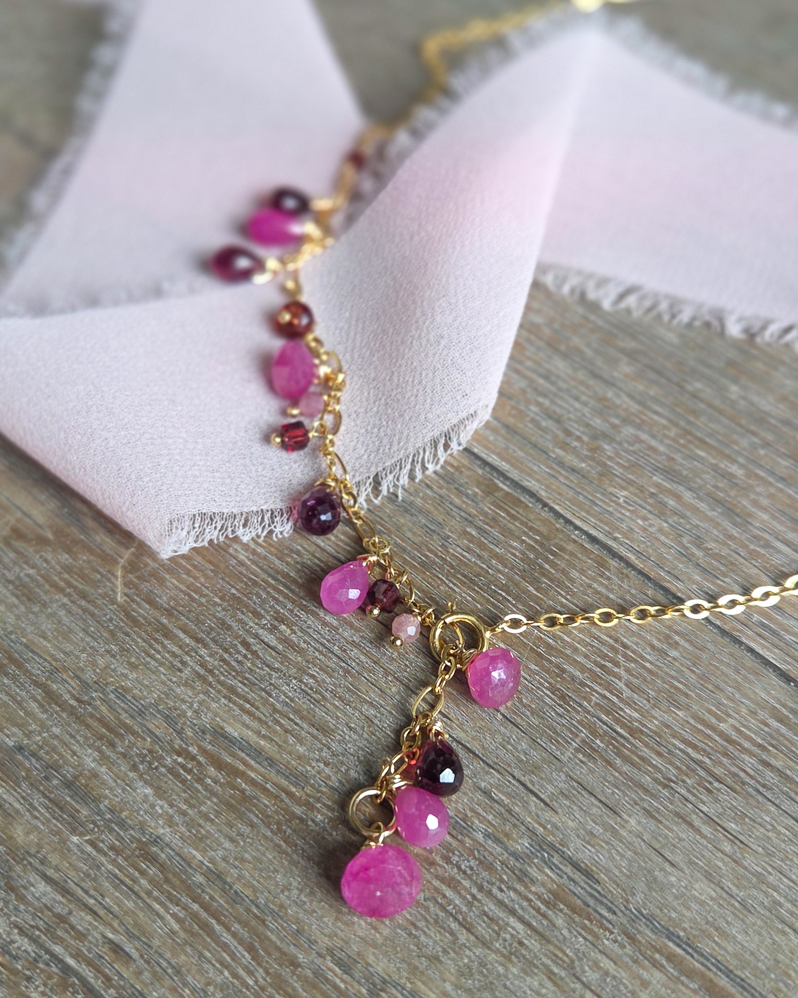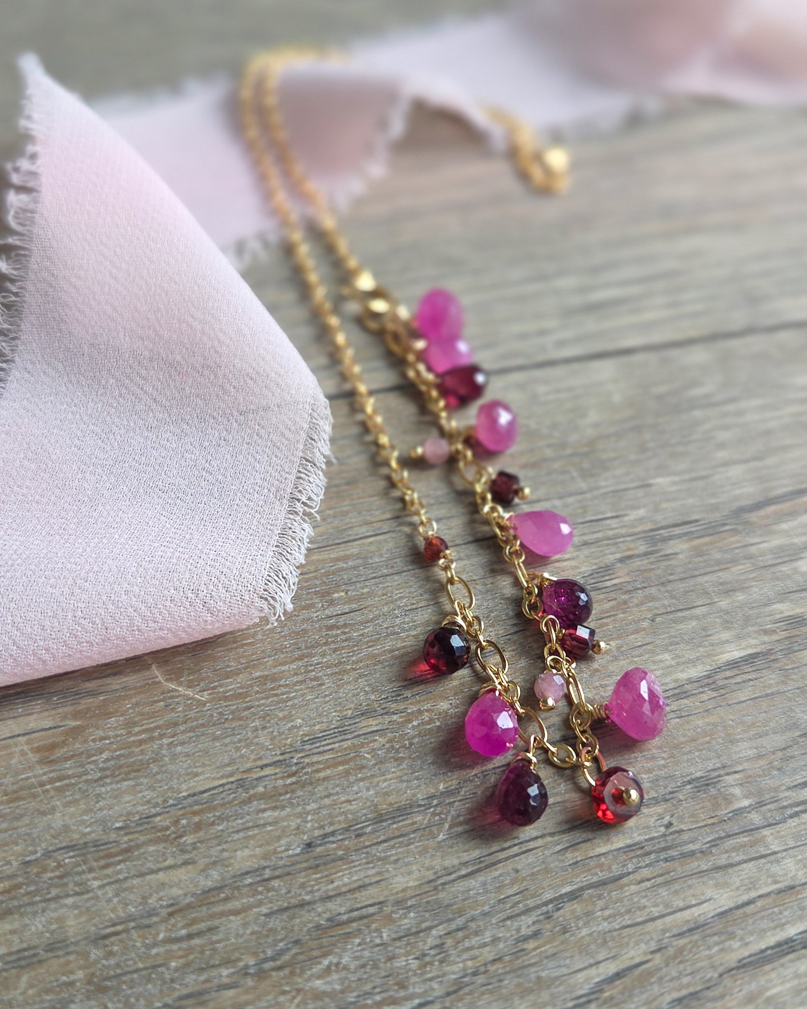 Realizzata in gold filled con gocce di zaffiro rosa e granato naturale, è lunga 40 cm ed è accompagnata da una prolunga di 4 cm per renderla più lunga.