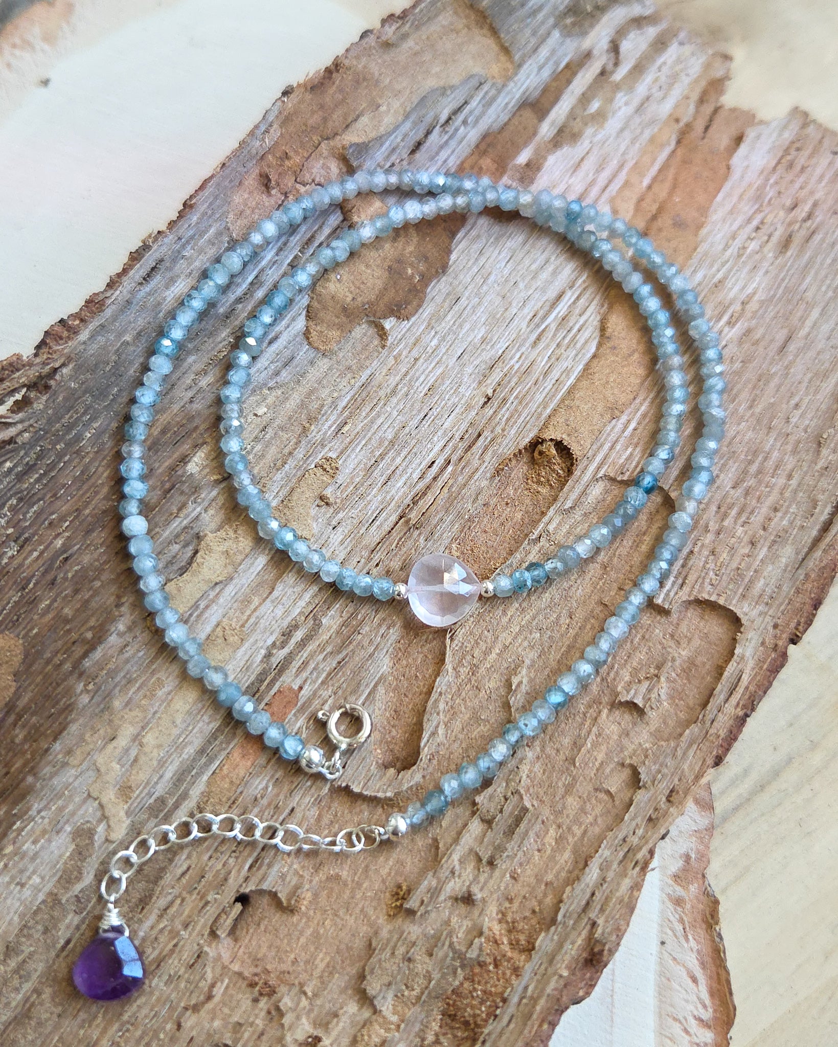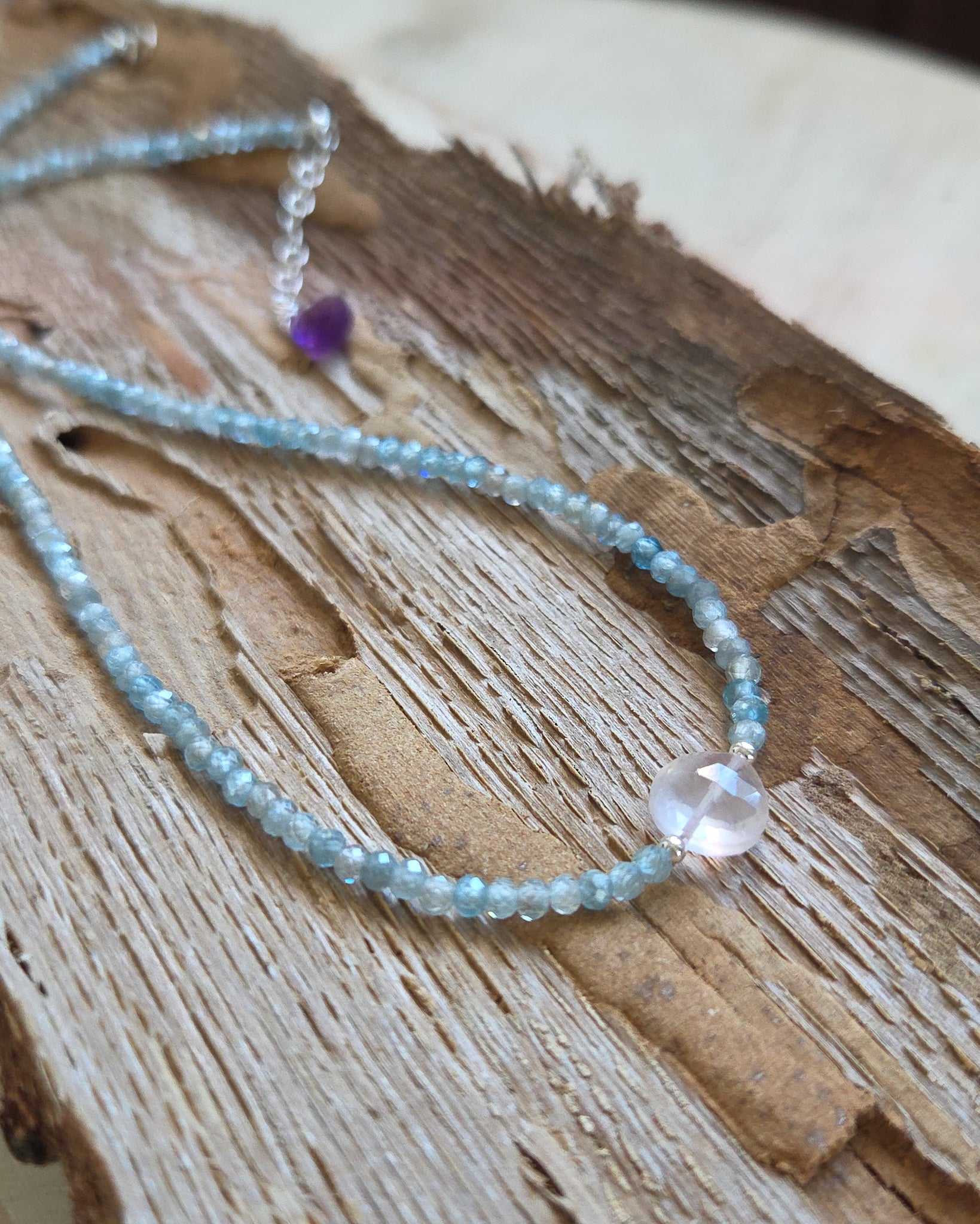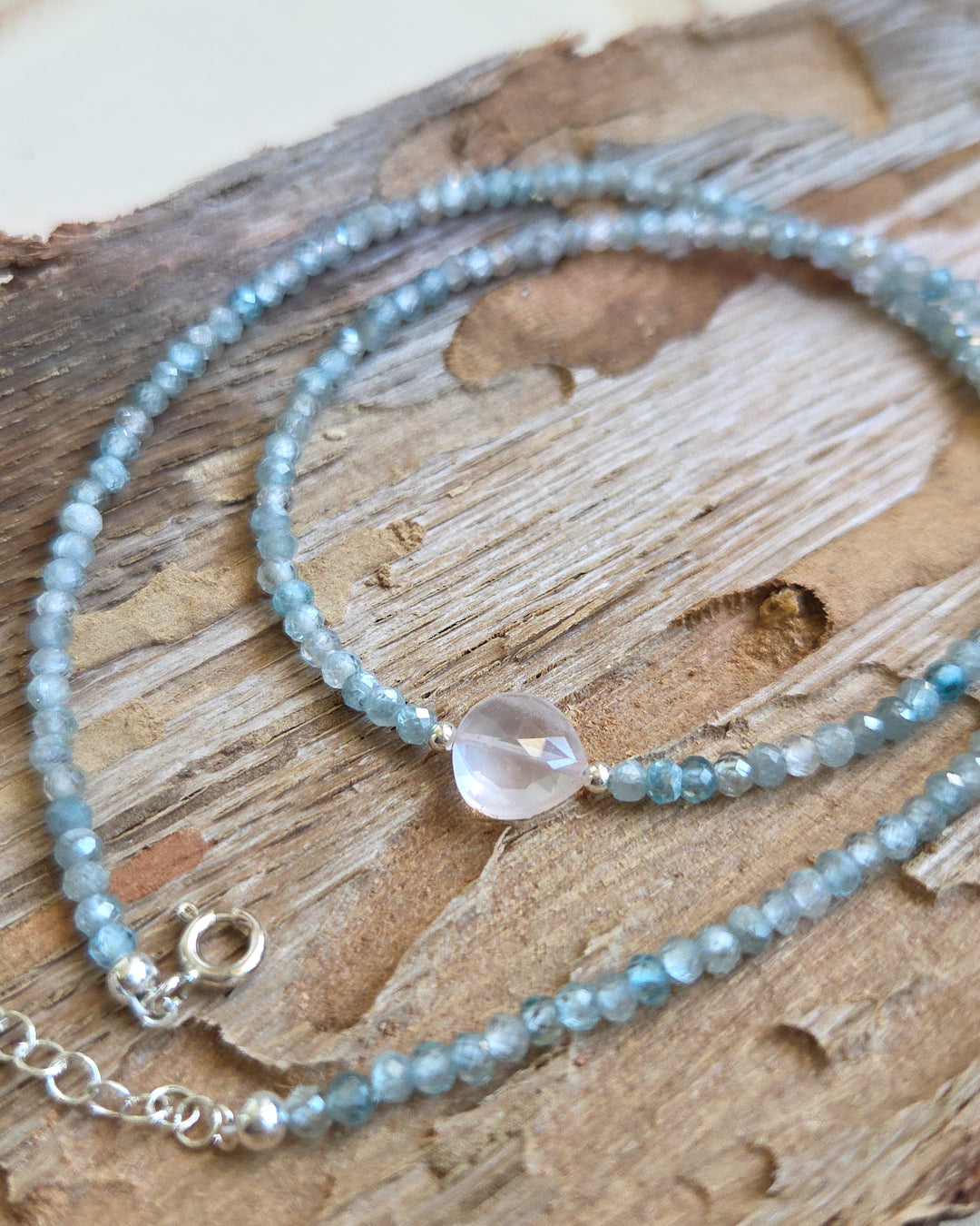 Un luminoso filo di acquamarina custodisce la gentilezza di un cuore di quarzo rosa: due gemme che si abbinano perfettamente, sia per il loro colore che per la loro energia purificatrice.