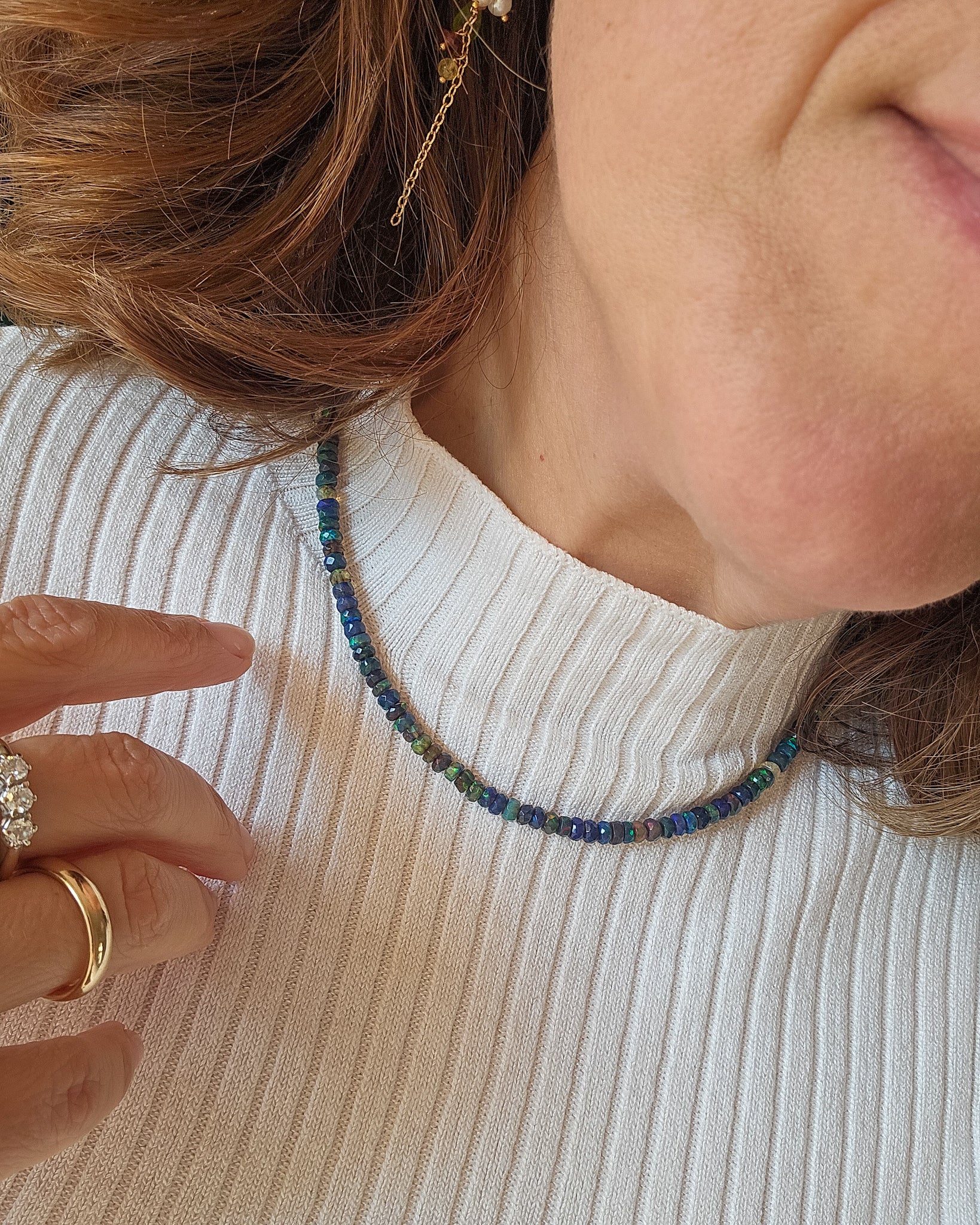 Un gioiello dal carattere deciso e misterioso. Realizzato su base in gold filled è lungo 43 cm e comprende un terminale da 4 cm che permette di regolarlo facilmente.