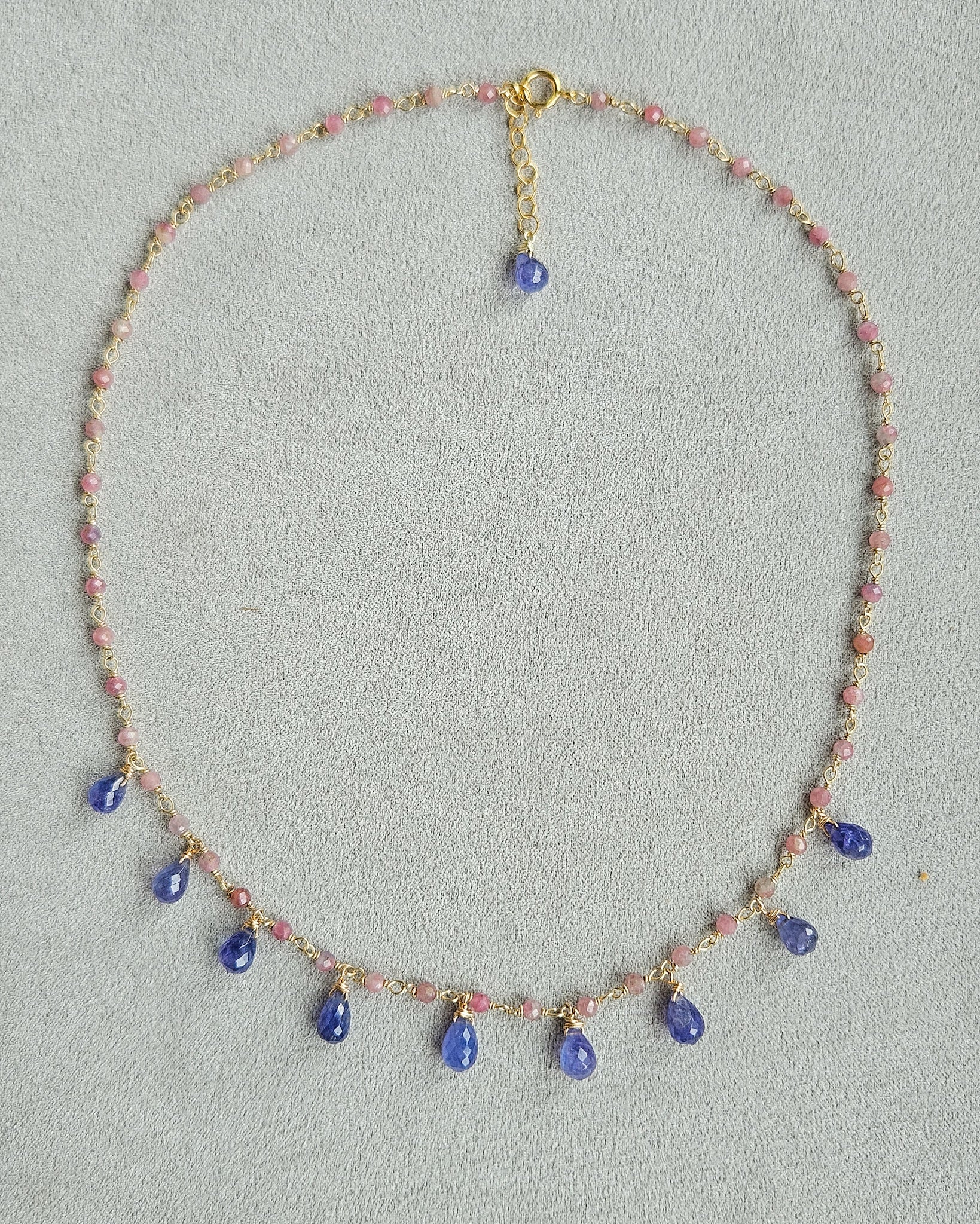 Un girocollo rosario delicato, in questa versione con tormalina rosa e gocce di tanzanite naturale, luminosa e intensa.