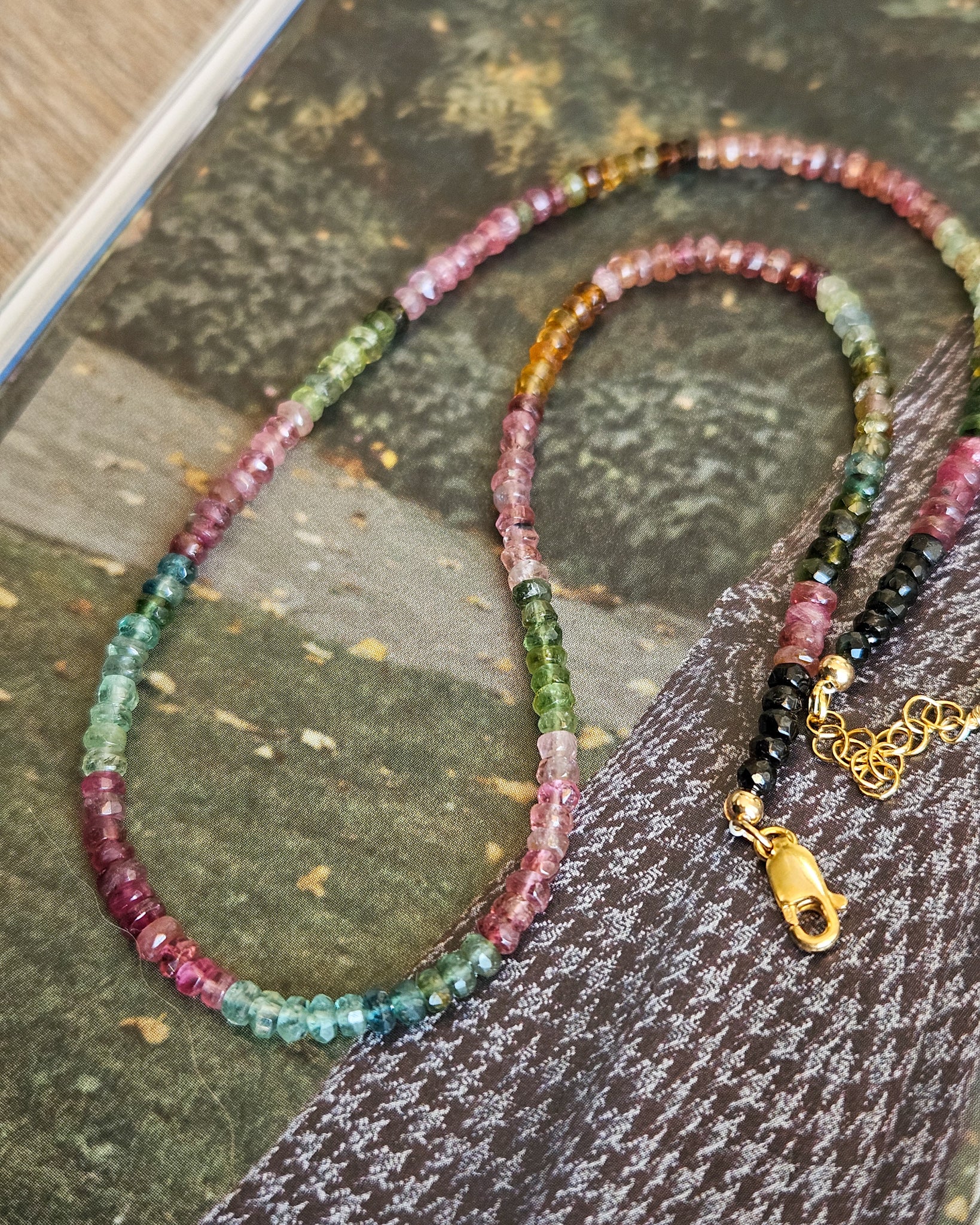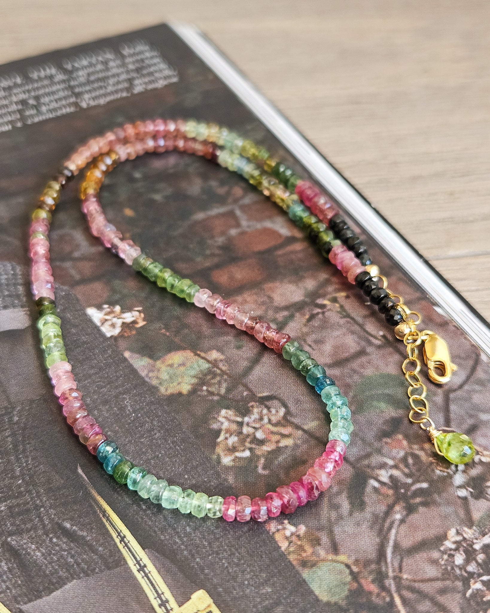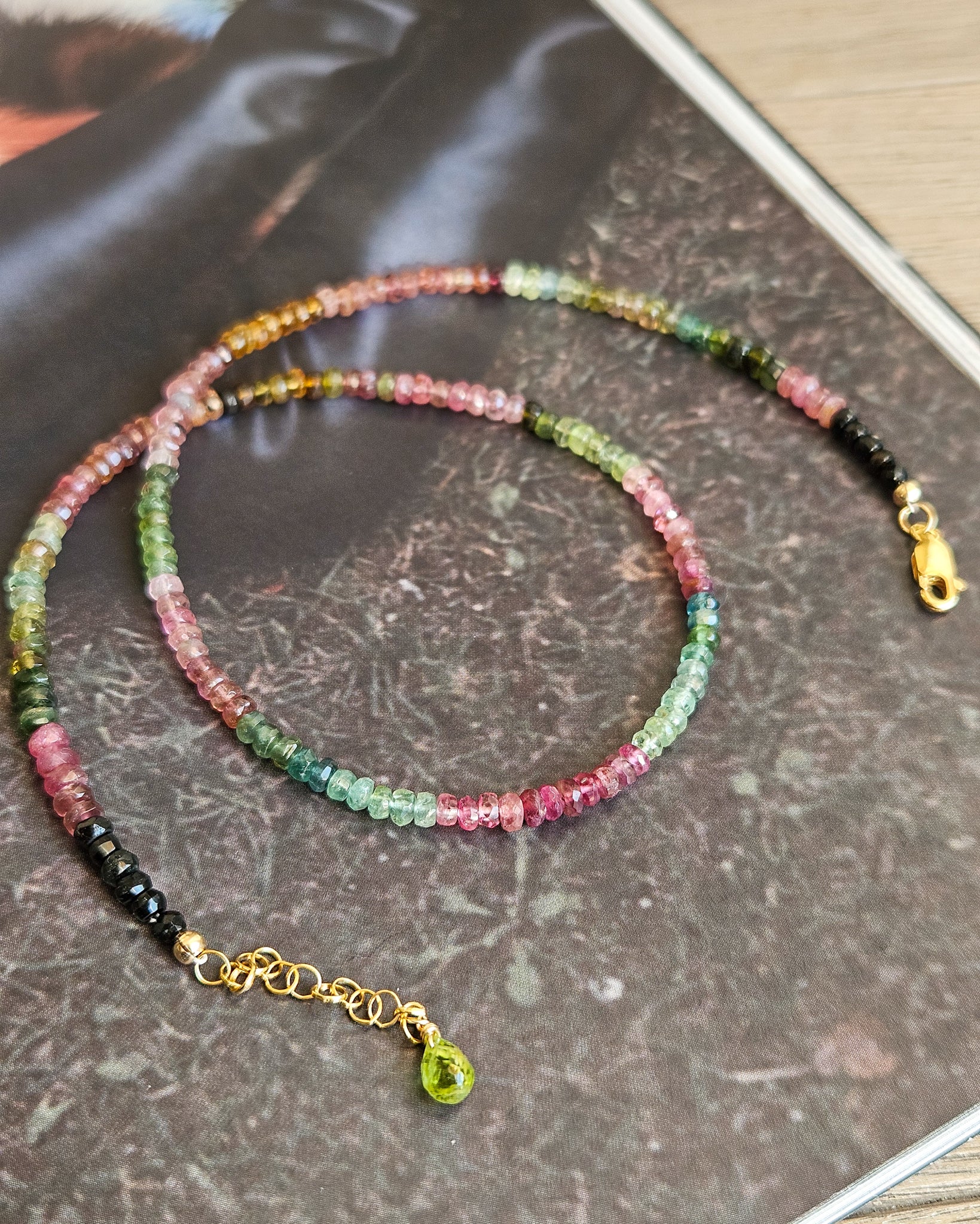 Un girocollo che nasce dall'incontro delle mille sfumature della tormalina. Non una pietra uguale all'altra che lo rendono unico.
