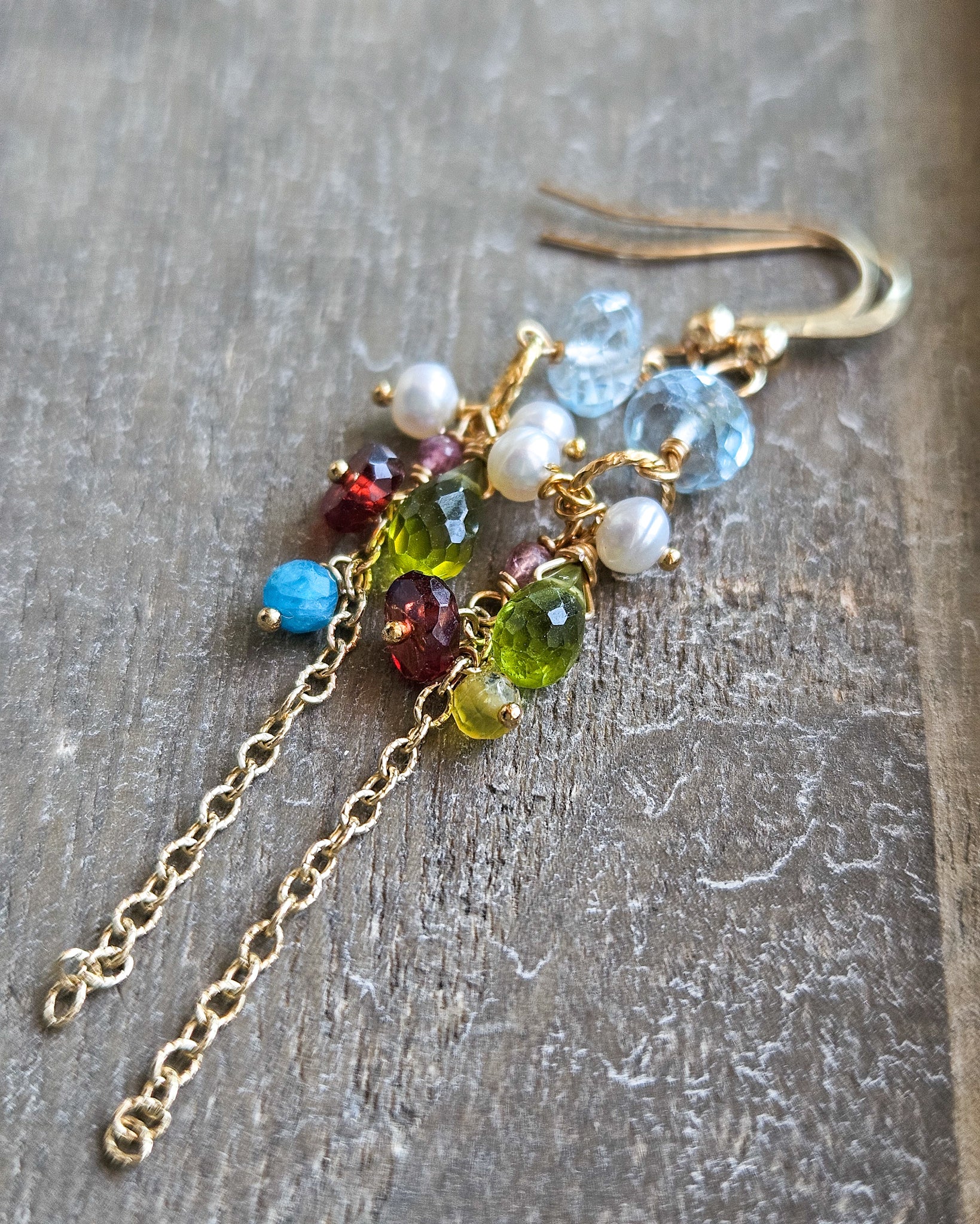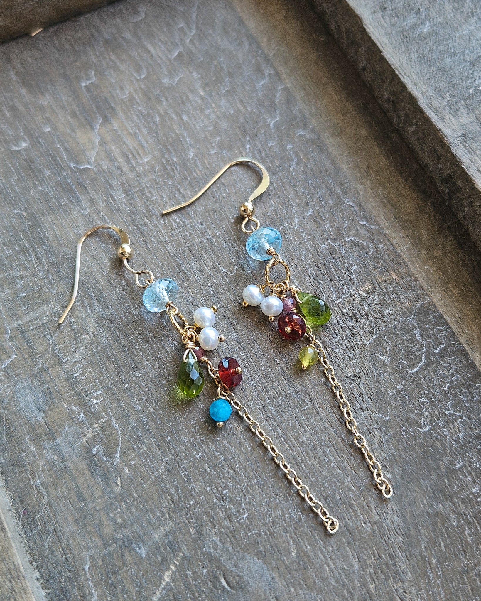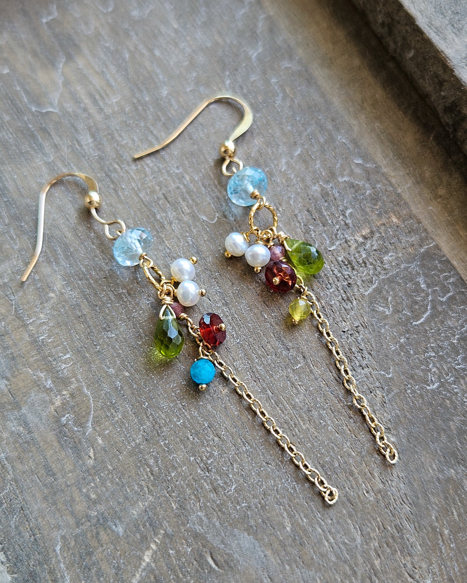 Realizzati con topazio azzurro, peridoto verde, granato e perle di fiume bianche, montate su una base in gold filled.
