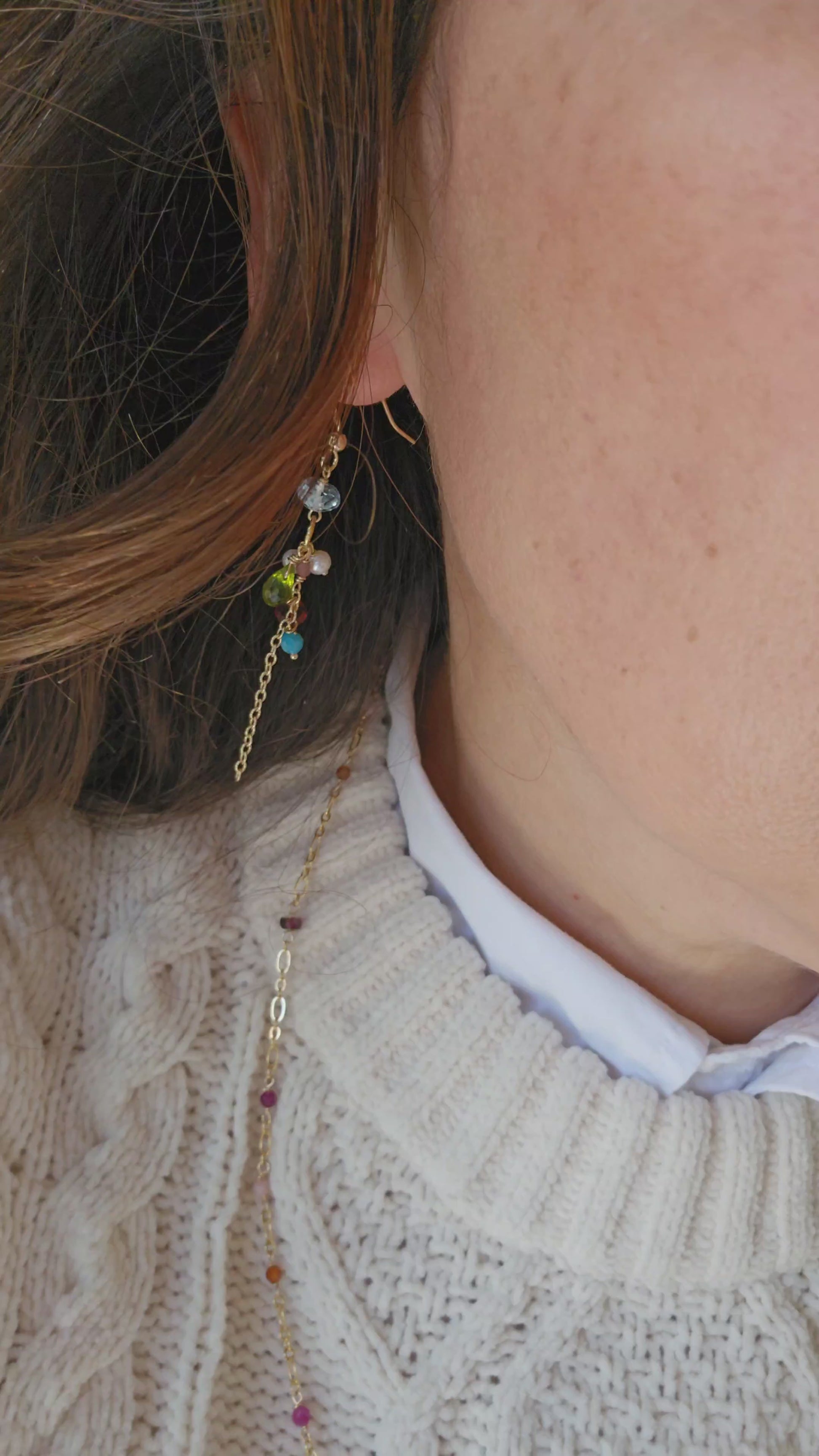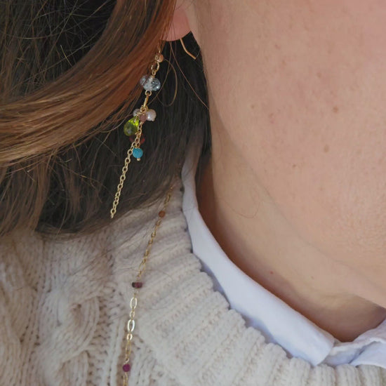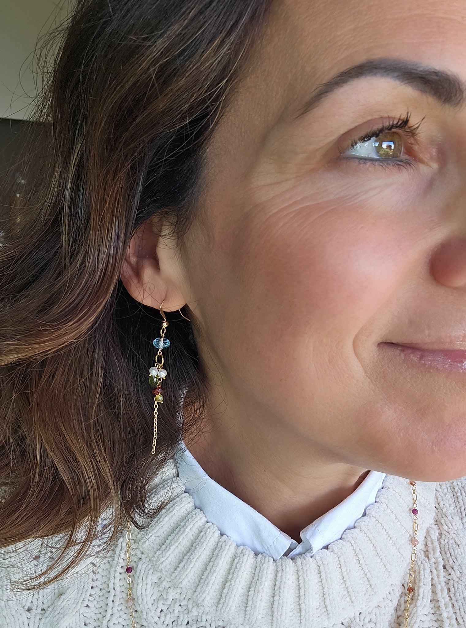 Realizzati con topazio azzurro, peridoto verde, granato e perle di fiume bianche, montate su una base in gold filled.